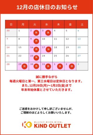 また12月29日(月)〜1月2日(金)まで年末年始休業とさせていただきます。